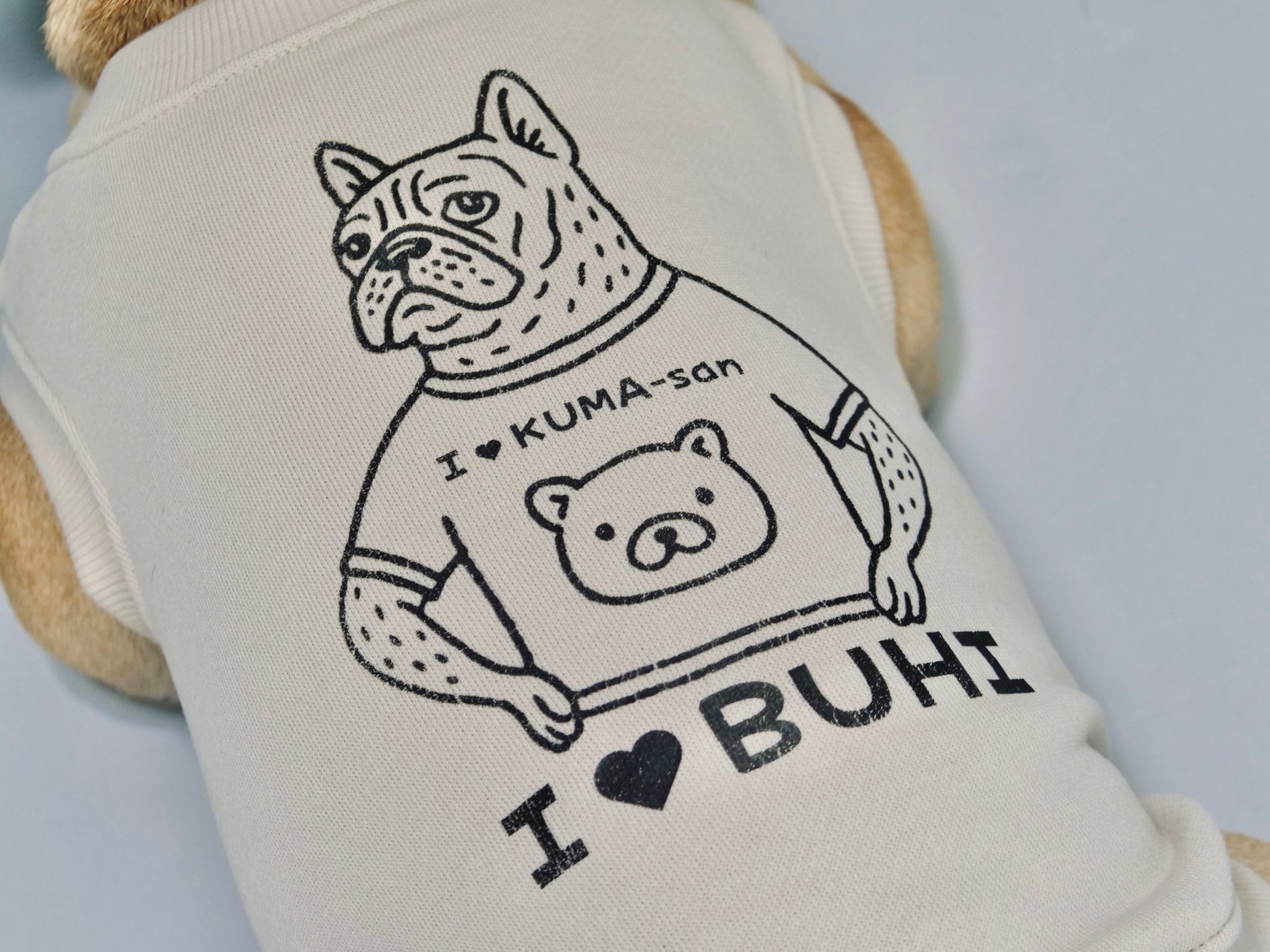 「I ❤ KUMA-san」を着ているブヒ。「I ❤ BUHI」を着ている愛ブヒ。すべて愛おしくなる、フレブルのための特別な一着です。